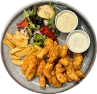 Ovaj specijalitet predstavlja savršenu kombinaciju hrskavo pohovanih trakica pilećeg filea i zlatno pečenog vedžis krompira. Servira se uz bogati cezar dresing koji savršeno dopunjuje ukus. Idealan izbor za one koji vole klasičnu italijansku interpretaciju modernih jela.