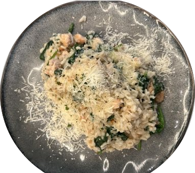 Ovo jelo predstavlja savršenu harmoniju ukusa italijanske kuhinje. Arborio pirinač kuvamo do kremaste teksture, kombinujući ga sa sočnim komadićima piletine i svežim spanaćem. Posebnu aromu daje mu kombinacija gorgonzole i parmezana, dok puter dodatno obogaćuje teksturu. Svaki zalogaj je prava eksplozija ukusa koja će vas odvesti pravo u srce Italije.